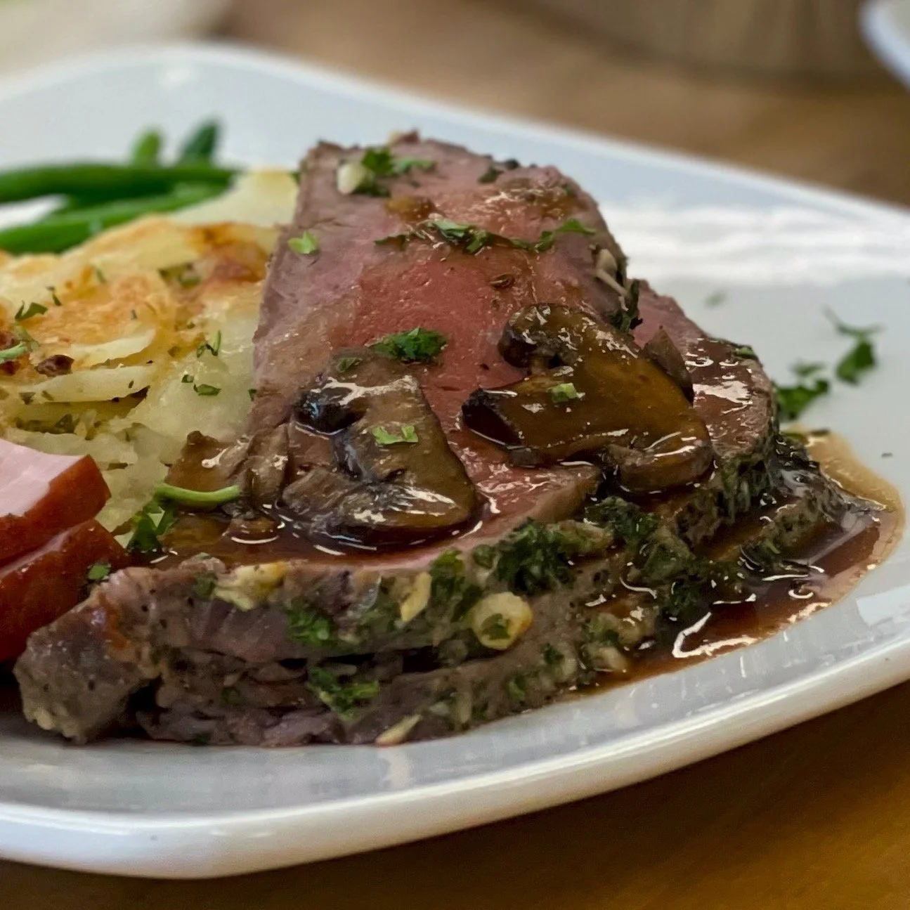 Duo of HERB-ROASTED BEEF STRIP LOIN with wild mushroom demi-glace + HONEY-GLAZED HAM (approx. 4 lb. each for 8 lb. total!)
